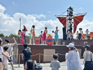 スプラッシュ・フェスは単なる水かけショーではない。三線や太鼓のリズムなど、沖縄らしい音楽演出がふんだんに盛り込まれているのだ。