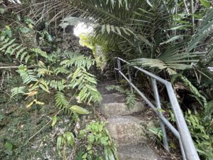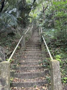 森のなか、かなり急な階段を昇っていく。