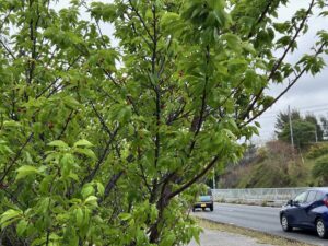 4月上旬、国道沿いの葉桜の中にもサクランボの赤い点々が見られる。